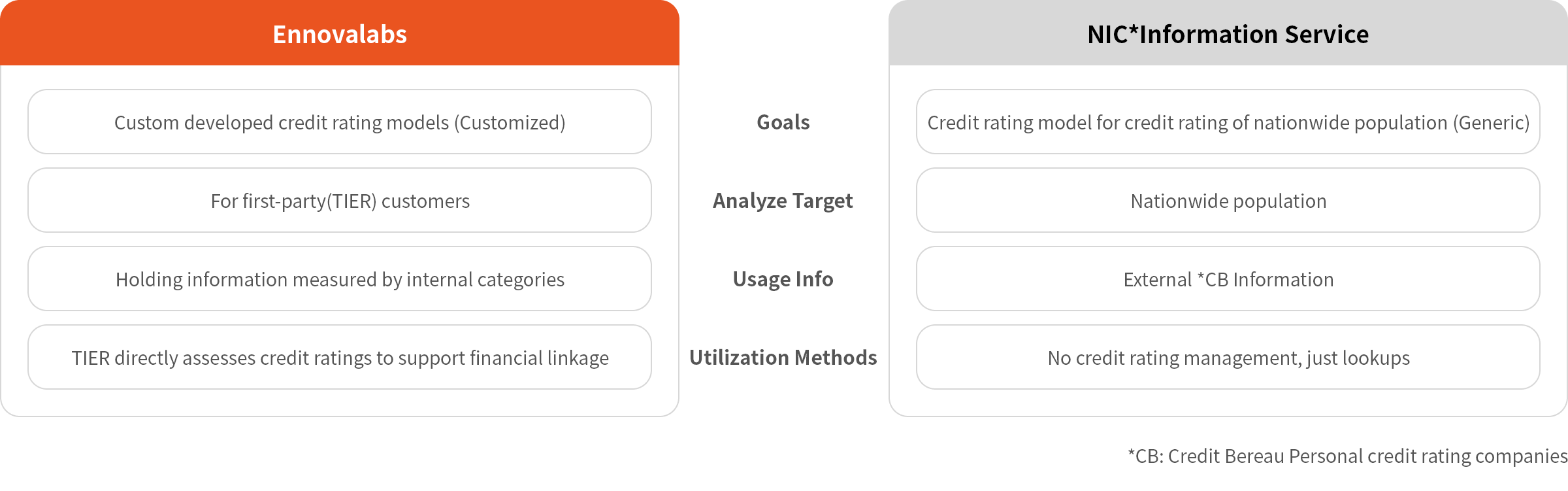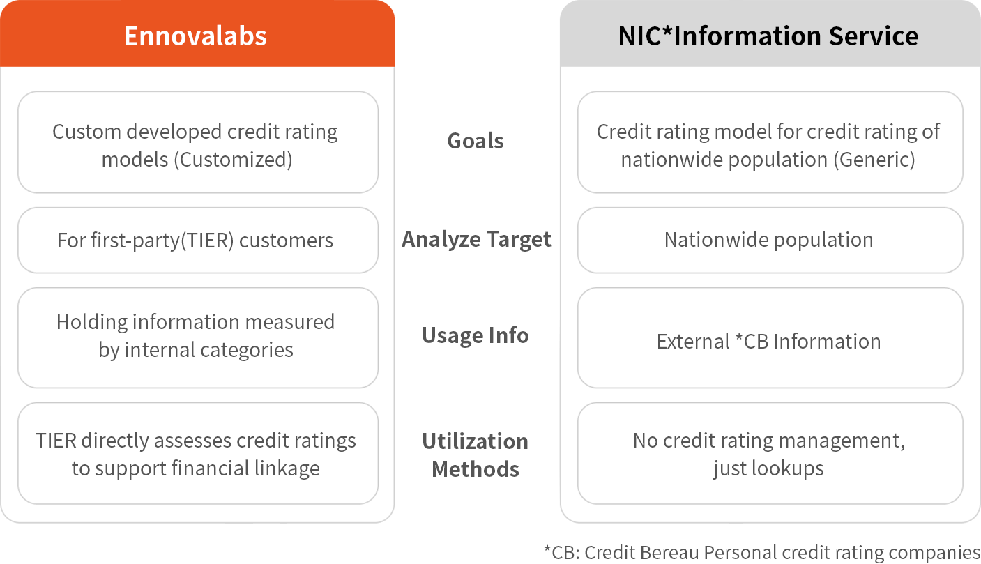 Ennovalabs develops and provides big data-based credit rating models by collecting data such as transaction history, average balance, and telecommunication bill payment performance for top-ups and transfers using our Tier (user, merchant) service.