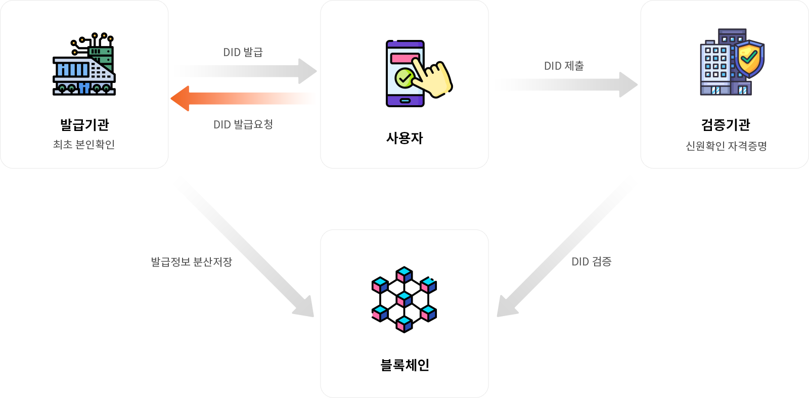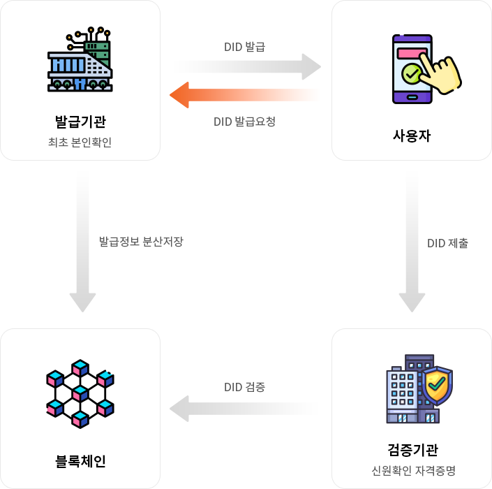 탈중앙화 신원증명 ‘DID(Decentralized Identity)’는 이용자 스스로 자신의 신원정보를 관리하고 통제할 수 있는 전자 신원관리 체계입니다.